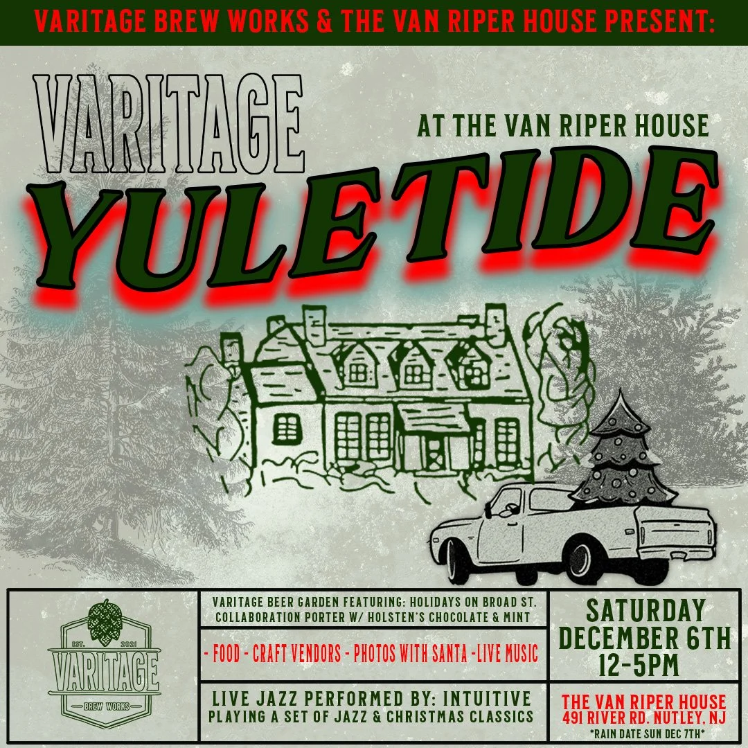 Join us for Yuletide at the Van Riper House on Saturday, December 6, 2025, a festive holiday celebration in partnership with Varitage Brew Works. The afternoon will feature seasonal craft beer, live jazz, photos with Santa, and holiday cheer at one of Nutleyβs most historic landmarks. All ages welcome!